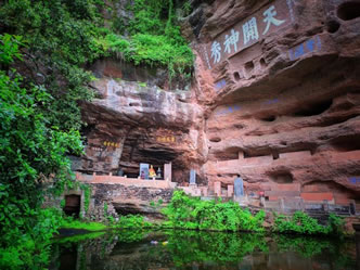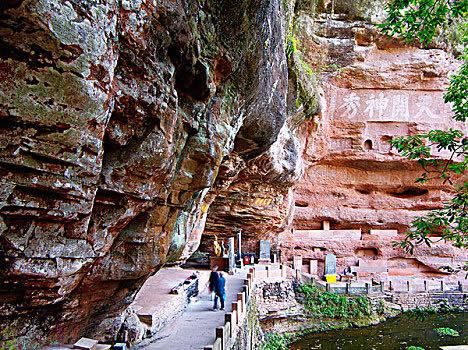 真仙洞府:過(guò)天門巖,下石階即達(dá)。這里危崖三彎折,相連如城垣。巖下通道沿砌石欄桿,欄外為碧蓮池,共構(gòu)一“叵”字形;崖間洞窟累累,依次有八仙洞、觀音洞、真仙洞(羅漢洞)、雨君洞、文昌洞、白馬洞、珠簾洞,就洞建宮宇,祀道教各路神仙,統(tǒng)稱真仙洞府。崖壁、摩崖題字石刻,如“天開神秀”、“齊云勝景”等多達(dá)近百處。