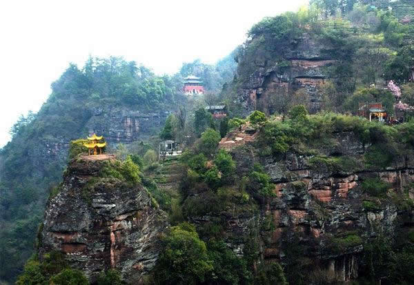 洞天福地:位于望仙亭東南,又稱桃源洞天。后倚丹崖?lián)泶氐恼拐a峰,前臨涓涓流淌的桃花澗。明代建有洞天福地祠、斗姆閣、寥陽(yáng)殿、青羊?qū)m,三元宮、桃源洞天亭等建筑,今圮;僅存八卦池、邋遢仙墓、仙人床及宮、閣、殿祠遺址。