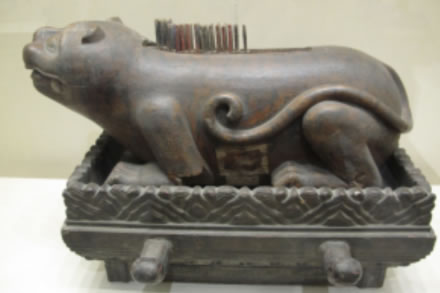 為中和韶樂樂器,“八音”中木制樂器,用于止樂。伏虎狀,背上列齟齬,趺三層,列崇牙,旁飾兩耳,用以置籈。中和韶樂中設柷、敔各一,分別由一人演奏。作樂時,舉麾則擊柷三聲,樂曲即開始。樂曲結(jié)束時,用籈逆刮虎背木齒三聲,樂曲即結(jié)束。