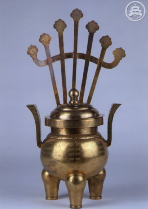 鍍金銀質(zhì)。體圓,直口平唇,短頸,鼓腹,兩側(cè)飾天官耳,腹下三足。爐口雷紋,通體刻八卦云鶴紋。爐蓋圓形,疊二層,上層鏤空乾、兌、震紋,后有香靠具缺刻。香靠具一付,從爐體內(nèi)壁靠具槽處插入爐內(nèi)。香靠具七出,鶴紋如意云頭,中間香插有圓框,以插圓形柱香。爐底陰刻楷書款“恒利銀號造京平足紋,重一百九十一兩五錢,鍍金十五兩三錢”“光緒癸卯年制”。