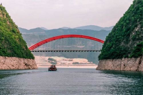 龍門大橋位于小三峽龍門峽峽口,在三峽水庫最終蓄水后,老龍門大橋主拱圈有三分之二以上部位被淹沒,橋下凈空不能滿足通航要求,因此拆舊橋建新橋。新龍門大橋與巫山長江公路大橋形成姊妹橋,遙相呼應(yīng)。巫山新龍門大橋位于巫山縣城旁,舊龍門大橋下游90米處的龍門峽峽口。大橋主跨采用240米鋼管混凝土中承式拱橋一跨跨過,路線全長855.911米。其主要工程量為鋼材2900噸和混凝土1.39立方米。全橋共兩拱肋,每肋13節(jié)段,11道橫撐,采用纜索無支架吊裝成拱。
