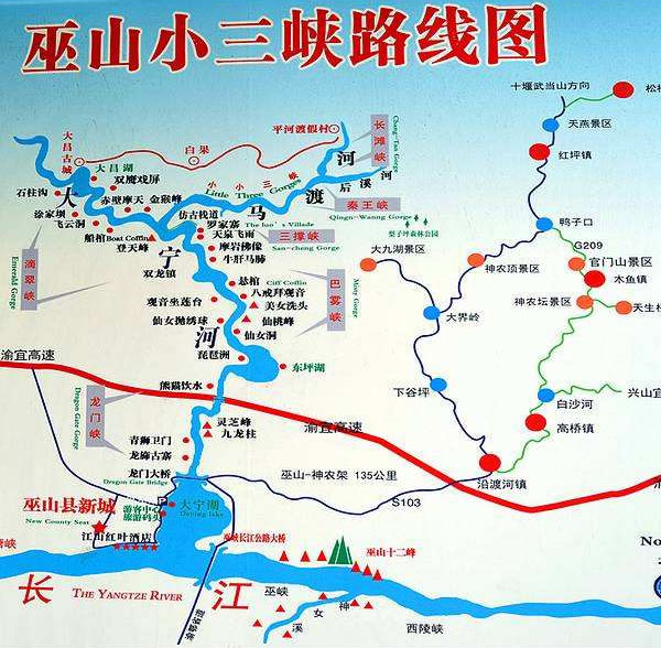 巫山小三峽·小小三峽景區(qū)全長65千米。有水峽景觀、峰巖景觀、洞穴景觀、動(dòng)植物景觀、人文景觀、空間景觀。其中水體景觀包括水、泉、溪、潭、灘、簾瀑、卵石等多種類型,峰巖景觀包括峭壁、山峰、奇石、圖案、肌理、色彩等多種類型,洞穴景觀包括發(fā)育程度各異、大小各異、高度各異、風(fēng)格各異的眾多喀斯特溶洞、地下河。