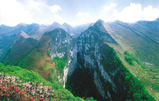 通靈大峽谷:位于靖西縣城東南部32公里的湖潤(rùn)鎮(zhèn)新靈村,古龍山水源林自然保護(hù)區(qū)的南端,由念八峽、銅靈霞、古勞峽、新靈峽、新橋峽組成,總長(zhǎng)10多公里。念八河從古龍山脈緩蜒而下,依次穿越五個(gè)峽谷,流入湖潤(rùn)臺(tái)地。每個(gè)峽谷內(nèi)薈萃了舉世罕見的特高瀑布群、洞中瀑布、地下暗河、峽谷溪流、洞穴奇觀、古石壘、古懸葬、原始植被等自然景觀與人文景觀。