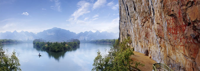 位于縣城西北25千米的明河畔,以其古老神奇的巖畫而聞名中外;ㄉ綆r畫是左江流域巖畫中的代表,也是世界同類巖畫中單位面積最大、畫面最集中、內(nèi)容最豐富、保存最完好的一處巖畫,被譽(yù)為是壯族文化的瑰寶。 1988年,花山巖畫被國務(wù)院列為全國重點(diǎn)文物保護(hù)單位。1998年,以花山巖畫為中心的花山風(fēng)景區(qū)被定為國家級風(fēng)景旅游名勝區(qū),成為與桂林漓江、桂平西山齊名的廣西三大國家級風(fēng)景旅游名勝區(qū)之一。2000年開始,國家文物局實(shí)施花山巖畫保護(hù)計劃,對保護(hù)巖畫進(jìn)行深入研究。2003年6月,寧明縣啟動花山巖畫申遺工作。2004年11月,國家建設(shè)部把寧明縣花山巖畫列入《中國申報世界遺產(chǎn)預(yù)備名單》。