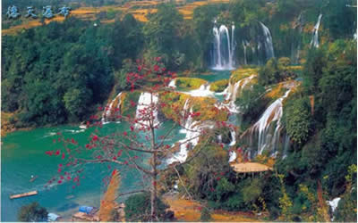 德天瀑布雄奇瑰麗,變幻多姿,碧水長流,永不涸歇。瀑布四季景色不同,春天凌草泛青,山花吐艷,瀑布四周被鑲起五彩繽紛的花邊;秋天梯田鋪金,層林盡染,高掛的銀簾霧氣沖天;冬天瓊珠閃閃,玉液潺瀑,山風把細流吹得飄飄灑灑;夏天激流如