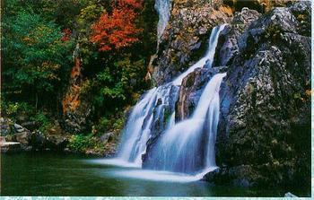 從仙人谷朝大平天方向溯溪而上,位于海拔597米的兩溪交匯處。山泉水從斷崖傾瀉而下,凌空飛瀉,形成落差30多米的瀑布。