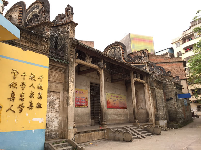 北流粵東會(huì)館位于今北流市城區(qū)永安路一里9號(hào)。始建于清乾隆二十年(1755年),建筑坐西向東,原規(guī)模為三進(jìn)兩廂兩天井一戲臺(tái),占地面積1400平方米,現(xiàn)僅存兩進(jìn)一廂,占地面積642.6平方米。硬山頂磚木結(jié)構(gòu),鑊耳山墻,小青瓦屋面、青磚墻,抬梁穿斗式混合梁架。屋脊灰塑雙龍戲珠及博古紋,前座檐墻及廂房墻端堆砌陶瓷樓閣人物圖,檐廊柱間梁以石獅如意云柁墩作承重,三根枋墩雕刻人物及如意云紋,雀替透雕吉祥紋飾。中座內(nèi)有4根花崗巖石柱支撐屋頂。庭院及通道均鋪設(shè)紅色階磚和花崗巖條石。