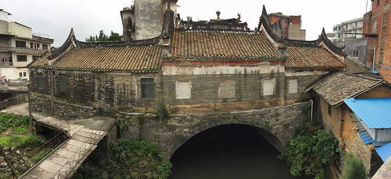 登龍橋在西河流向圭江的入口處。據(jù)資料記載,該橋始建于宋元年,全長(zhǎng)36.3米,拱跨10米,高5.5米,寬13.5米。橋面一邊為橋的通道,中間建風(fēng)雨亭,為歇山頂磚木結(jié)構(gòu);一邊建殿堂,青磚砌墻,青瓦覆蓋,硬山頂磚木結(jié)構(gòu)。頂部磚砌灰雕花脊,兩端飾鰲魚(yú),中間為火球。殿內(nèi)墻端繪飾古壁畫(huà),園木柱作頂柱。橋東牌坊上刻著“登龍橋”三個(gè)大字,整座建筑風(fēng)格獨(dú)特,莊重樸實(shí)。為北流八景之“龍橋夜月”所在。