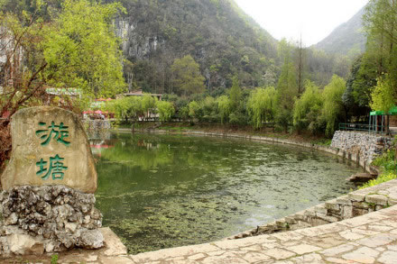 漩塘是國家級風(fēng)景名勝區(qū),在龍宮的上游。一個(gè)面積達(dá)萬余平方米的圓塘,池水不借風(fēng)力,日日夜夜、年年歲歲永不停歇地沿著順時(shí)針方向旋轉(zhuǎn)著。景象珍奇,令游客陶醉。通漩河的水流到這里便沉入地下,變?yōu)榈叵掳岛。塘面呈圓形,一年四季塘水以順時(shí)針方向,挾帶水上綠色浮萍不停地漩轉(zhuǎn),終年不息。