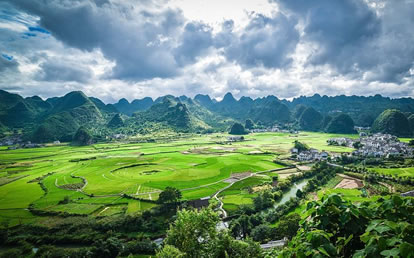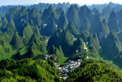從地質(zhì)學(xué)的角度看,北部為峰林盆地,中南部為峰林洼地和峰叢山地,峰林、峰叢大多為呈錐形,部分為鐘狀、平頂狀和馬鞍狀,堪稱一座“中國錐狀喀斯特博物館”。南北兩段峰林也各具特色,北部峰林如同一道屏風(fēng),護(hù)佑著耳寨、魚隴、雙生、樂立一帶的村寨田園。這里奇峰如林,田壩似錦,河水如帶,村寨如云,充滿詩情畫意,恰似一幅樸素、清麗的布依族織錦。