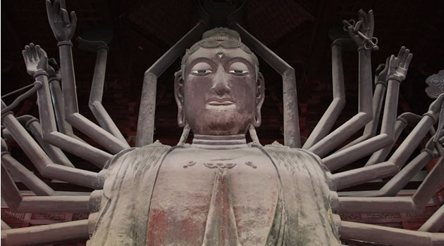 隆興寺:位于石家莊市正定縣縣城,是國(guó)內(nèi)現(xiàn)存時(shí)代較早、規(guī)模較大而又保存完整的佛教寺院之一。隆興寺始建于隋開皇六年(586年),原名“龍藏寺”。宋初,太祖祖趙匡胤敕令在龍藏寺內(nèi)鑄造銅佛,并蓋大悲閣,遂大興土,以大悲閣為主體的一組宋代建筑先后告成。到了清康熙、乾隆年間,又兩次大規(guī)模維修和增建,寺院發(fā)展到鼎盛時(shí)期。清康熙四十八年(1709),改龍藏寺為隆興寺,俗稱大佛寺。 隆興寺這座千年古剎,歷代帝王曾多次到此巡境幸駐蹕,上香禮佛,題詩書匾,刻碑立石?梢姰(dāng)年這里晨鐘暮鼓,鐘磬齊鳴,香煙繚繞,“南無”聲聲的歷史盛況。大悲閣是隆興寺的主體建筑,五檐三層,高33米。閣內(nèi)正矗立著高大銅佛鑄像,這就是名聞遐邇的正定大菩薩。這尊千手千眼觀音菩薩像有22.28米高,有42臂分別執(zhí)日、月、凈瓶、寶杖、寶鏡、金剛杵等法器。面部情端祥恬靜,仁慈莊重。達(dá)到了瞻之彌高、仰之益恭的藝術(shù)效果。