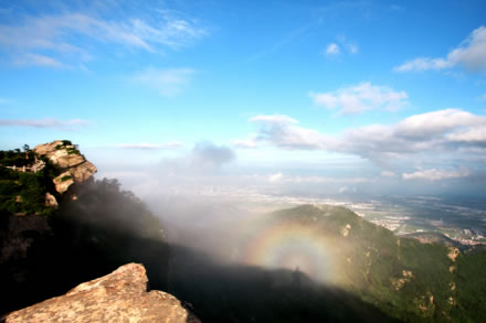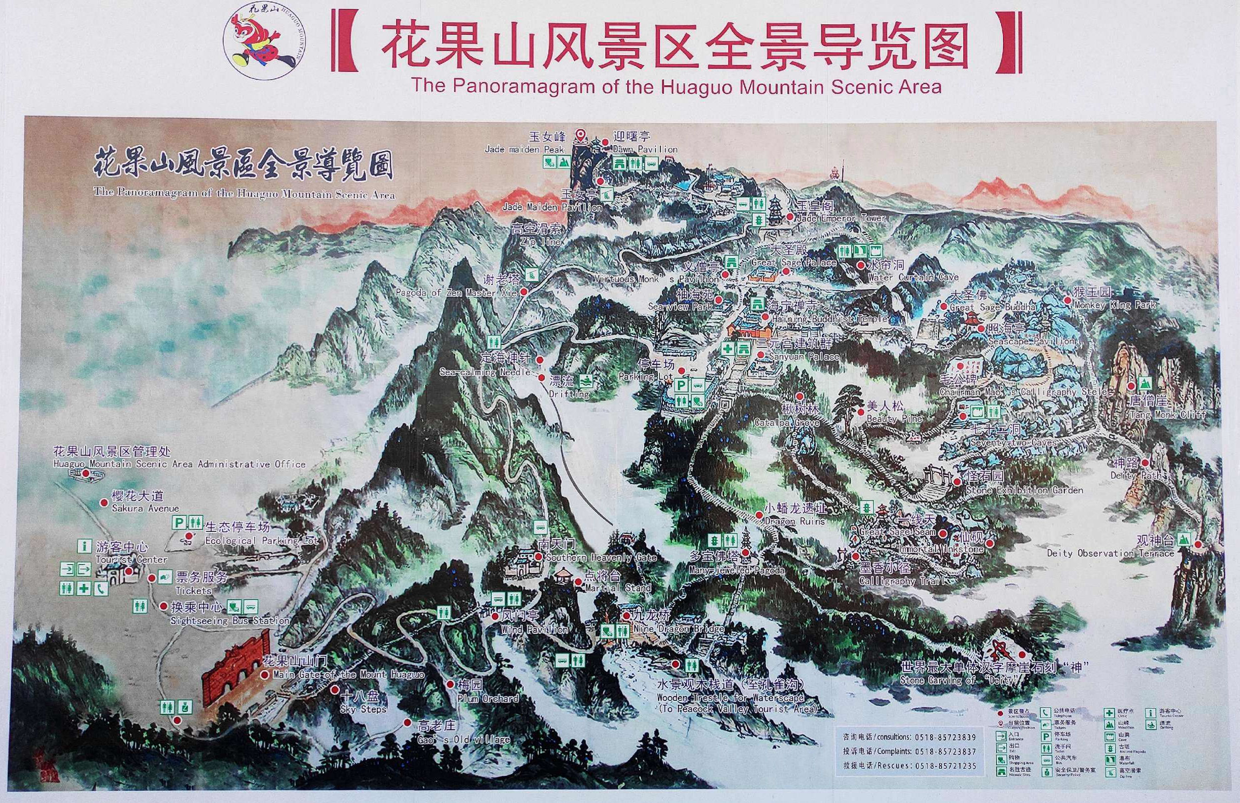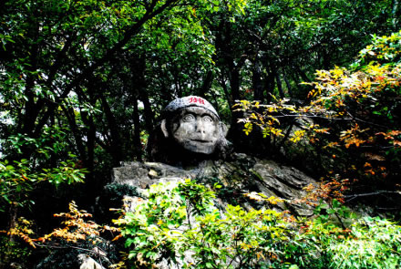 從遠(yuǎn)處山腰眺望一線天,這里就是著名的八戒石.很像一個(gè)戴著僧帽的老豬在綠樹(shù)叢中呼呼大睡。一線天下面是花果山山名摩崖石刻,游客都愛(ài)在這里留影,青山紅字,非常壯麗。這里還有天然碑、硯石等景觀。沿小路前進(jìn)可至墨香小徑,里面有百余位當(dāng)代書(shū)法名家的作品刻在天然石塊上;還可至怪石園,看千奇百怪與《西游記》有關(guān)的象形石!吧瘛弊滞踉跂|部禿龍溝下,是刻在山體上的懷素草書(shū)“神”字,長(zhǎng)39.4米、寬15.8米,為世界上最大的單體漢字,1996年被載入吉尼斯世界紀(jì)錄。 登上玉女峰是花果山之游的高潮,有緣的人在這里可看到云臺(tái)山兩個(gè)最為精彩的景致。一個(gè)是在迎曙亭看海上日出;另一個(gè)是看云臺(tái)鋪海,白云翻滾好像海水揚(yáng)波,露出來(lái)的峰頂就像大海里的蓬萊仙島,群山俯伏,阡陌縱橫,此情此景令人有飄飄欲仙的感覺(jué)。