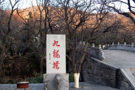 九龍橋是因?yàn)樯缴嫌芯艞l山澗像九條舞動(dòng)著的龍,從四面八方匯集于橋下而得名。那時(shí)候百姓都相信龍是神,一些香客就在此橋小憩一刻,來(lái)沾一點(diǎn)龍的壽氣,再進(jìn)山求佛,保全家萬(wàn)事平安,因此九龍橋又叫萬(wàn)壽橋。傳說(shuō)花果山上原來(lái)有十條龍,九條龍?jiān)谏嚼锩孀≈,為了防止外族侵犯,便派了一條本事最大的禿龍到東面的山頭守衛(wèi)。山東莊還有禿龍山,那龍山上還有兩個(gè)對(duì)穿的山泉就是傳說(shuō)中的龍耳。我們可以在橋上往南望,那遠(yuǎn)處的村莊便是山東莊。九龍橋畔有一棵千年老銀杏,粗大的枝椏已經(jīng)擠進(jìn)了橋身,橋上橋下布滿(mǎn)樹(shù)蔭,給游客提供了休息納涼的理想場(chǎng)所。