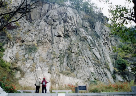 唐僧崖,又叫“大佛崖”,是由片麻巖石風(fēng)化而成的一堵高達(dá)數(shù)十米的峭壁陡崖。站在三元宮停車(chē)場(chǎng)東望,即可見(jiàn)唐僧和孫悟空師徒倆立在崖上的形象:唐僧兩耳垂肩,佛眼微閉,背稍躬,好像正在肅目修行;右旁一天然石猴,似乎在與唐僧耳語(yǔ)。神采逼真,栩栩如生。走到近前,由于崖壁紋理復(fù)雜多彩,還可以看到許多奇景點(diǎn)綴其間,有師徒對(duì)話、舍身飼虎、獨(dú)角鬼王等,所以有人又把它叫做“萬(wàn)佛崖”。
