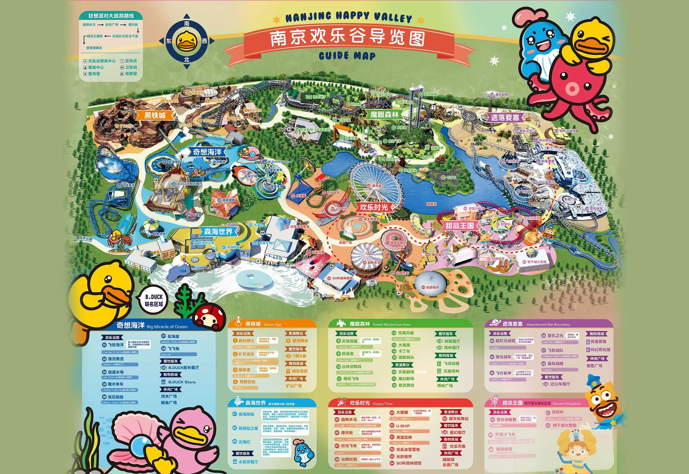 南京歡樂谷擁有歡樂時光、遺落要塞、甜品王國、黑鐵城、奇想海洋、魔眼森林六大園區(qū),與香港知名品牌B.Duck小黃鴨、動畫IP餅干警長進(jìn)行了創(chuàng)意聯(lián)動。此外,南京歡樂谷首次在樂園中融入硬核蒸汽朋克風(fēng),推出集復(fù)古情懷、機(jī)械美學(xué)、哥特建筑等特色于一體的區(qū)域“黑鐵城”,為城市青年的假日休閑注入了更多的潮玩基因。