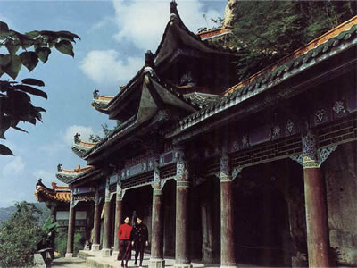 由一級高臺拾級而上,即達(dá)二級高臺(象征城墻的臺座)。這兩級高臺共有89級臺階,而新閣恰于1989年落成開放。二級高臺的墻體及地坪,均為江西峽江縣所產(chǎn)花崗石。高臺的四周,為按宋代式樣打鑿而成的花崗石欄桿,古樸厚重,與瑰麗的主閣形成鮮明的對比。