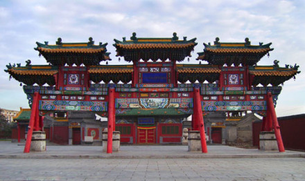 大召,明代稱“弘慈寺”,歷史上又有“銀佛寺”“大乘法輪召”“甘珠爾廟”“帝廟”等多種稱謂。大召,是一座大藏傳佛教寺院,是呼和浩特最早建成的黃教寺院,也是蒙古地區(qū)僅晚于美岱召的蒙古人皈依黃教初期所建的大型寺院之一,屬于格魯派(黃教)。占地面積約3萬平方米,其中建筑面積為8000多平方米。大召寺院座北向南,總體布局是伽藍(lán)七堂形制,由正院、東倉和西倉三大院落單位成,東西兩倉各有倉門,北端互通構(gòu)成環(huán)繞寺廟的甬道。主軸線上由山門、天王殿、菩提過殿、大雄寶殿和九間樓組成。大召的藏品豐富,堪稱大召“三絕”的銀佛、龍雕、壁畫佛殿內(nèi)的各種彩塑、金銅造像、晾佛節(jié)展開的巨幅唐卡、108部的甘珠爾經(jīng)卷,以及宗教活動使用的各種法器,面具等都是較珍貴的歷史文物和藝術(shù)珍品。