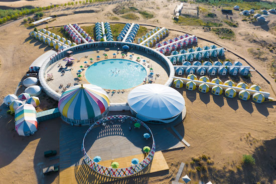 一粒沙度假村與沙漠各島隔河相望,于罕臺(tái)河?xùn)|岸半山腰,河水從它的門前流過,對岸是茫茫沙海,在這里體驗(yàn)水上瑜伽,水中健身操或參加游泳比賽。