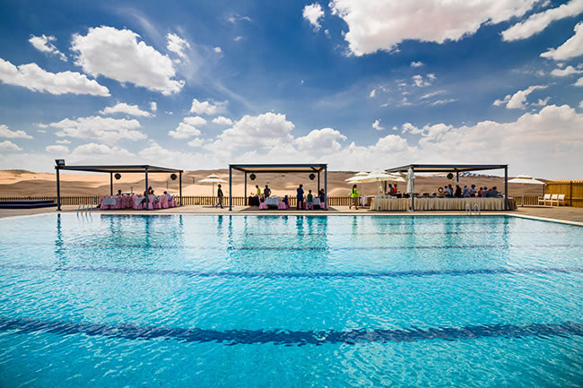 在沙漠中各種深淺的大型泳池里,以各種泳姿釋放自己——在沙丘起伏無際的沙漠里——在沙漠中屬于自己的水的世界里……累了,就躺在清爽的沙灘床上,美美地過上幾個(gè)小時(shí),同時(shí)可以與同行的人邊吃邊喝邊聊哦,別睡著了,演出一定會(huì)有的,悅沙島每天會(huì)有十多場不同的演出或比賽,是藝術(shù)的、是體育的……