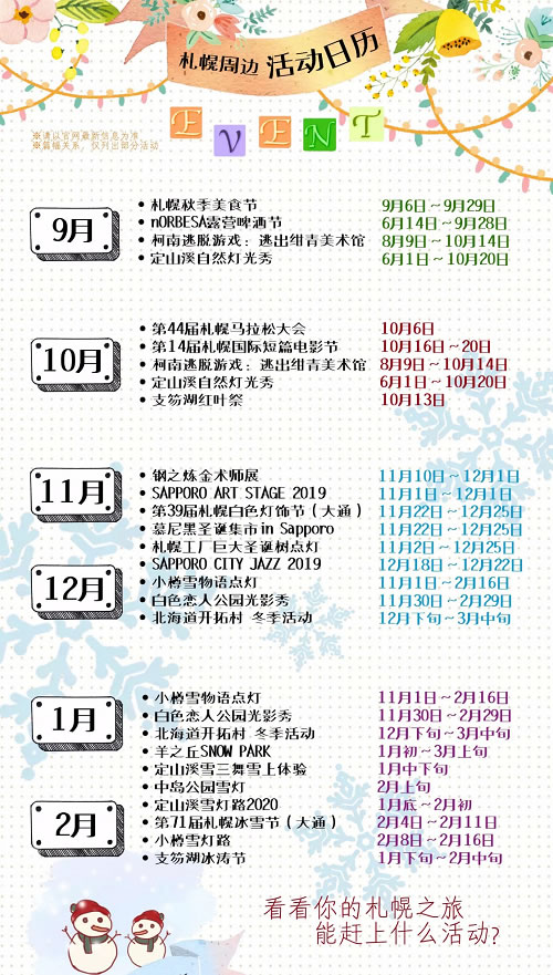 下面這張是不完全版札幌周邊活動日歷,快看看你的札幌之旅能趕上什么活動?
