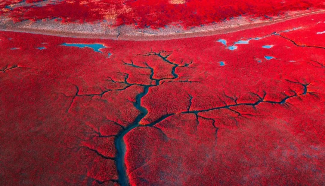 黃河口、遼河口濕地秋天里會鋪上一望無際的“紅地毯”,這種名叫“鹽地堿蓬”的鹽生植物,因分布面積廣又有著火紅顏色,竟然在不知不覺間染“紅”了近半個中國,形成了壯美的紅色景觀。鋪天蓋地般蓬勃出濃烈的色彩和生命張力。這是草木生命的綻放,于空闊的無人之境,自然呈現(xiàn)。