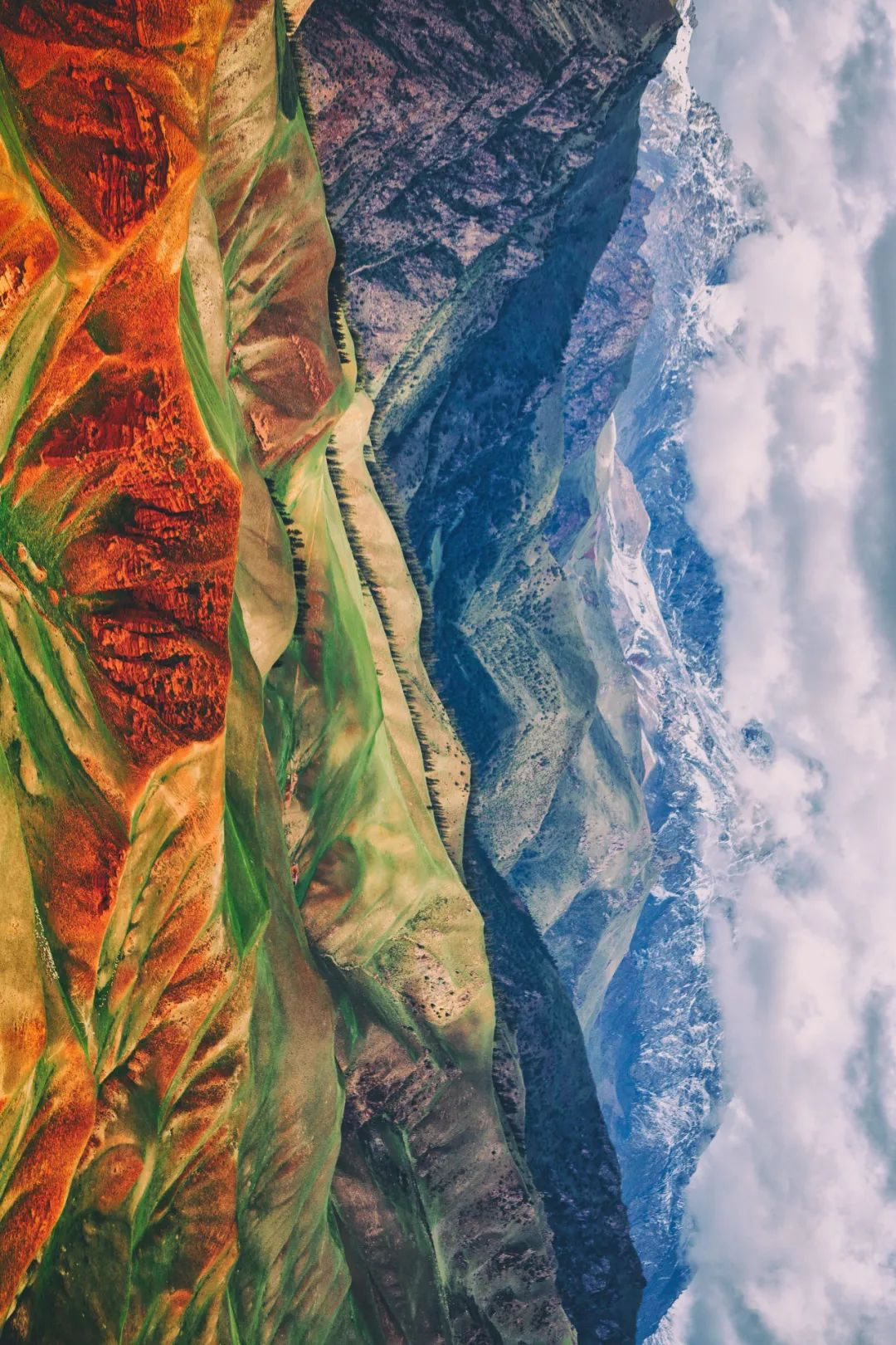 在西北干旱區(qū),從新疆、甘肅的戈壁綠洲到寧夏、陜北的黃土高原,億萬年以來沉積環(huán)境的變化造就了地層中不同化學(xué)元素的積累,顯現(xiàn)出深淺不一的色帶,地殼的構(gòu)造運動使得原本水平的地層發(fā)生不同角度的傾斜和抬升,流水的切割和風(fēng)沙的吹蝕,將這些延綿不絕的彩色條帶暴露于地表,并斑駁成多種多樣的形態(tài)。