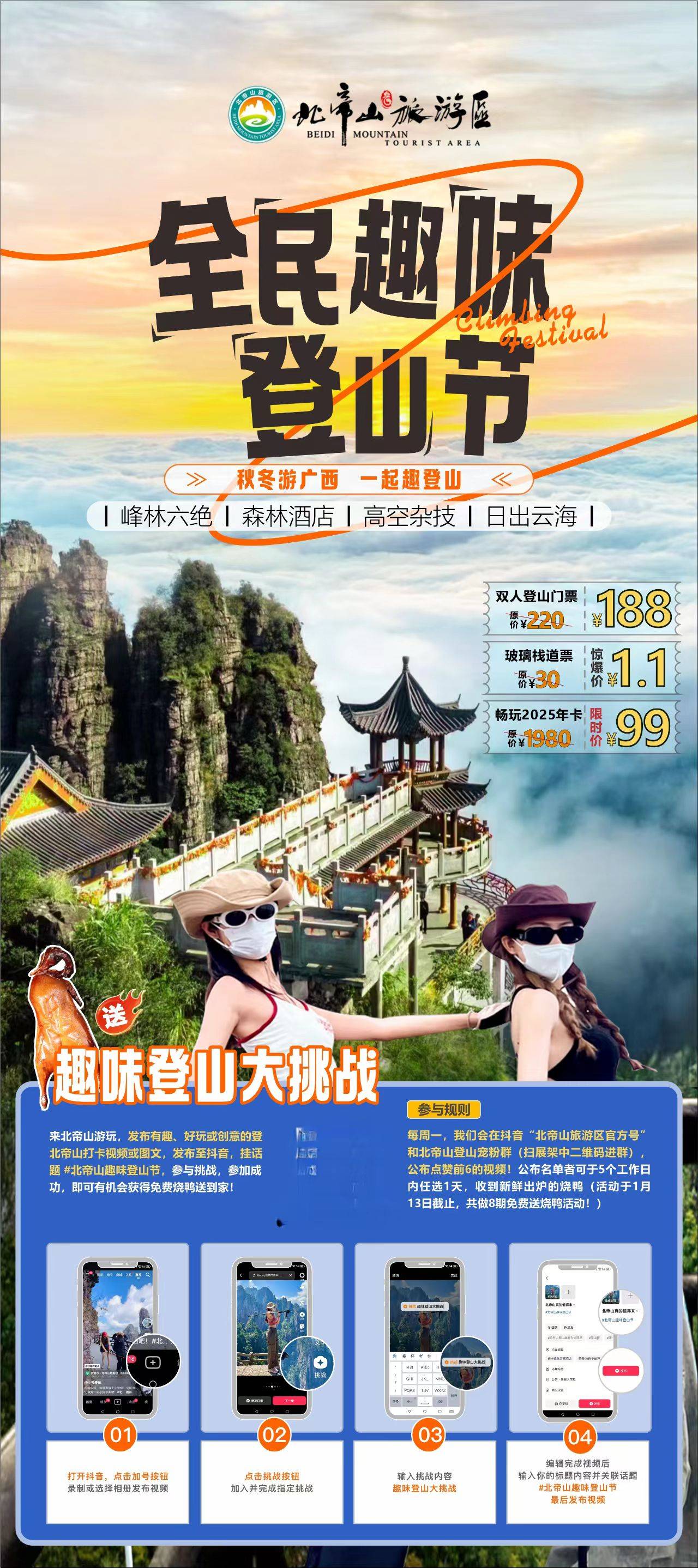 北帝山喊你來打卡!把你的鏡頭對準北帝山,無論是打卡的、炫酷的、或搞笑的,只你大膽曬出來!發(fā)布至抖音,參加趣味登山大挑戰(zhàn)掛話題#北帝山趣味登山節(jié),即可參加成功贏免費燒鴨送到家!