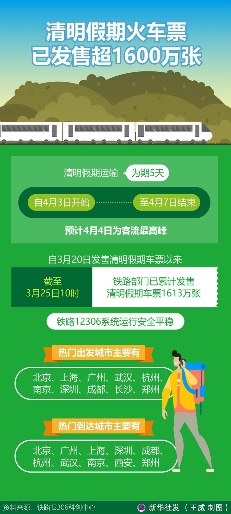 記者25日從鐵路12306科創(chuàng)中心獲悉,清明假期運輸自4月3日開始,至4月7日結(jié)束,為期5天,預(yù)計4月4日為客流最高峰。自3月20日發(fā)售清明假期車票以來,截至3月25日10時,鐵路部門已累計發(fā)售清明假期車票1613萬張,鐵路12306系統(tǒng)運行安全平穩(wěn)。