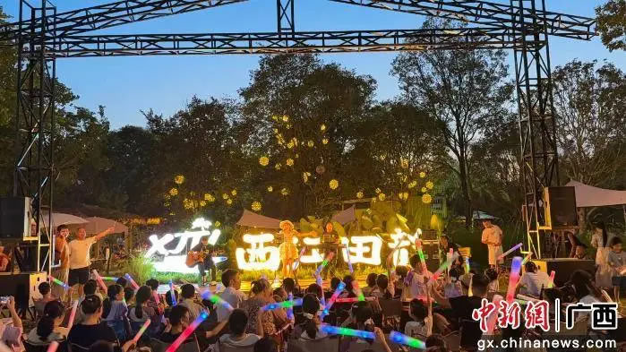 西江田韻休閑營地的草坪音樂會人氣爆棚。每日傍晚,草坪上坐滿游客,主辦方邀請多風(fēng)格樂隊、歌手現(xiàn)場演出,動感流行曲與舒緩民謠交替響起,旋律在田野間回蕩。游客或鋪野餐墊圍坐,或站在草坪邊緣揮舞熒光棒,隨節(jié)奏輕搖,享受獨特音樂盛宴。