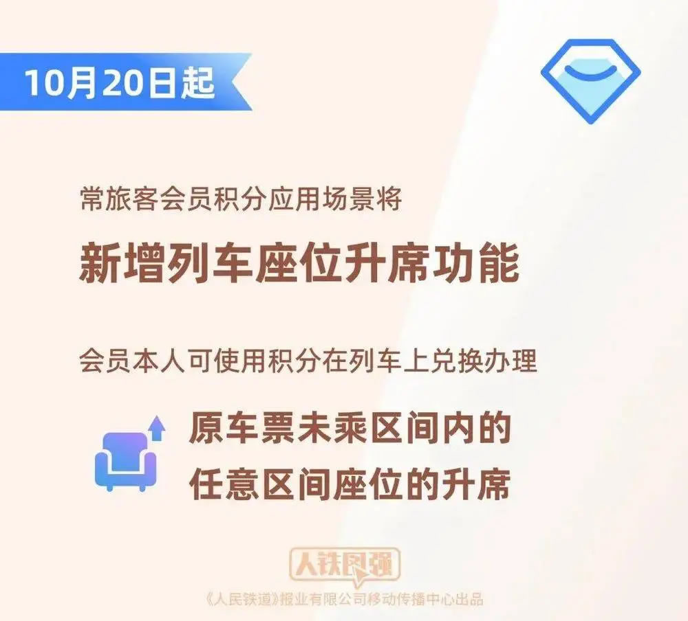 10月20日起,常旅客會員積分應用場景將新增列車座位升席功能,會員本人可使用積分在列車上兌換辦理原車票未乘區(qū)間內(nèi)的任意區(qū)間座位的升席。乘車途中,會員可掃描座椅扶手上的“鐵路暢行”二維碼登記升席需求,也可直接聯(lián)系列車工作人員辦理;接到旅客升席需求后,列車工作人員將根據(jù)列車座席空余情況及時進行辦理。