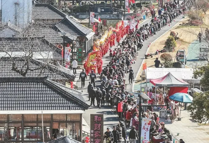 長街宴不僅是味蕾的盛宴,更是一場傳統(tǒng)文化的嘉年華。與美食相伴的是氣勢如虹的舞龍隊、古樸熱鬧的中馬燈巡游、精彩的舞獅表演,在大山村,殺年豬的傳統(tǒng)儀式、虎虎生風(fēng)的少兒武術(shù)、靈動活潑的小馬燈、喜慶昂揚的舞蹈等節(jié)目輪番上演,生動呈現(xiàn)了高淳非遺民俗的獨特魅力。
