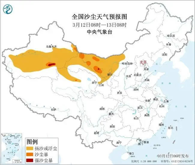 受大風(fēng)天氣影響,預(yù)計(jì)3月12日08時(shí)至13日08時(shí),新疆東部和南部、內(nèi)蒙古西部、甘肅西部、青海北部、寧夏中北部等地的部分地區(qū)有揚(yáng)沙或浮塵天氣,其中,新疆南疆盆地東部、內(nèi)蒙古西部、甘肅西部局地有沙塵暴或強(qiáng)沙塵暴。