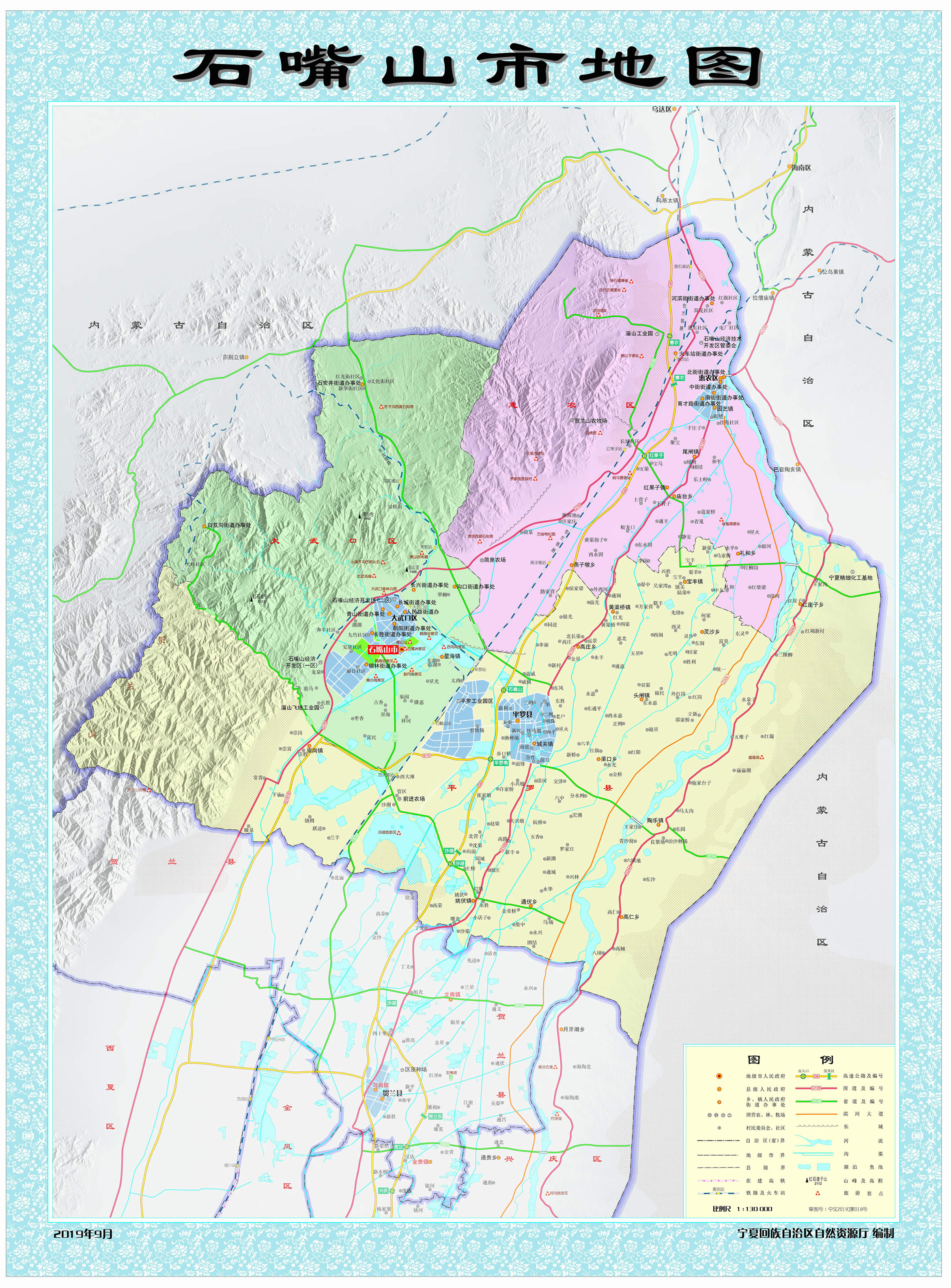 1975年11月23日,撤銷銀北地區(qū),恢復(fù)石嘴山市。石嘴山市因賀蘭山與黃河交匯處“山石突出如嘴”而得名,歷史悠久,秦朝時設(shè)渾懷障,西漢時設(shè)置第一個行政建制——廉縣,悠久歷史造就了厚重的文化底蘊,孕育了賀蘭山巖畫、古長城、北武當壽佛寺、平羅玉皇閣、田州塔等人文古跡,擁有移民文化、賀蘭山文化、工業(yè)文化等民宿文化;地理位置較為優(yōu)越,地處寧東、蒙西兩個國家千億噸級煤田之間,是呼包銀蘭經(jīng)濟帶、寧夏沿黃經(jīng)濟區(qū)、寧蒙陜?yōu)踅鹑墙?jīng)濟區(qū)的重要節(jié)點城市;距銀川河?xùn)|機場100千米,包蘭鐵路、京藏高速、烏瑪高速、109國道、110國道等貫穿全境,被列為國家公路運輸樞紐城市、區(qū)域流通節(jié)點城市之一;黃河穿東過,西依賀蘭山,湖泊星羅棋布。市境內(nèi)有5A級旅游景區(qū)沙湖、國家水利風景區(qū)星海湖等風景名勝。