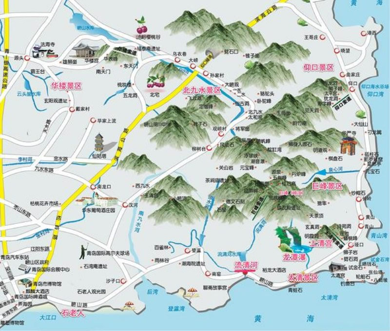 3、中線:也是由李滄區(qū)李村出發(fā),向東經(jīng)北龍口轉(zhuǎn)北,經(jīng)北宅,烏衣巷赴北九水景區(qū)。若時(shí)間允許,此線可于途中游覽華樓景區(qū);亦可驅(qū)車經(jīng)柳樹臺(tái)攀巨峰,步行過潮音瀑亦可達(dá)巨峰。由大嶗觀可轉(zhuǎn)赴仰口景區(qū)。