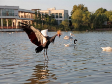 鶴類濕地沿天鵝湖而建,四面環(huán)水,有著仿自然的生態(tài)環(huán)境。這里有丹頂鶴、白枕鶴、白鸛、蓑羽鶴、灰鶴、冠鶴等。每日黃昏時間,群鶴共舞共鳴,鶴類濕地每天都會有動物科普講解以及動物喂食互動節(jié)目。