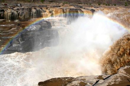 壺口瀑布反復(fù)沖擊所形成的水霧,升騰空中,使陽(yáng)光發(fā)生折射而形成彩虹。彩虹有時(shí)呈弧形從天際插入水中,似長(zhǎng)龍吸水;有時(shí)呈通直的彩帶橫在水面,象彩橋飛架,有時(shí)在濃煙騰霧中出現(xiàn)花團(tuán)錦簇,五光十色,飄忽不定,撲朔迷離,為天下奇觀。