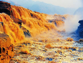 在高處河岸上,幾乎是看不到“龍槽”和黃河水流,只能看到紫褐色基巖河床中一線急騰翻卷的黃濁水塵和聽到轟鳴不息的奔騰濤聲。這槽中激流就象一鍋滾沸的水,左奔右奪,奔騰翻滾急下,激起的水霧彌漫在龍槽之上,使黃河在這里變得朦朦朧朧。每逢汛期黃河水漲時(shí),洪水溢出壺口龍槽一端,龍槽東岸會(huì)出現(xiàn)一道一、二千米長(zhǎng)的漫流水簾,十分壯觀。遠(yuǎn)望龍槽,彎彎曲曲的峽中石槽,活象一條搖頭擺尾的巨龍,壺口是龍頭,一口吞沒(méi)黃河巨流。孟門是龍尾,腹泄河水于下游。