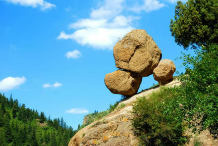 寧武縣城30公里處的東寨鎮(zhèn)西樓子山南麓半坡,有一座峭巖矗立于溝側(cè)溪畔。這峭巖高約兩丈余,頂部巍巍托起一塊巨大奇石。這奇石以兩塊小石作支腳,立于約三四十度的峭巖斜坡頂部。奇石高約3米,闊約2米。雖立斜坡,風(fēng)吹似動(dòng),但數(shù)干百年來,它卻一直屹立在那里。由于奇石狀似加蓋的鍋,支撐它的兩小石形若鍋腳,故而人稱“支鍋奇石”,成為古寧武府和寧武縣八大奇景之一。據(jù)關(guān)專家考察,該奇石形成于第四紀(jì)冰川期。