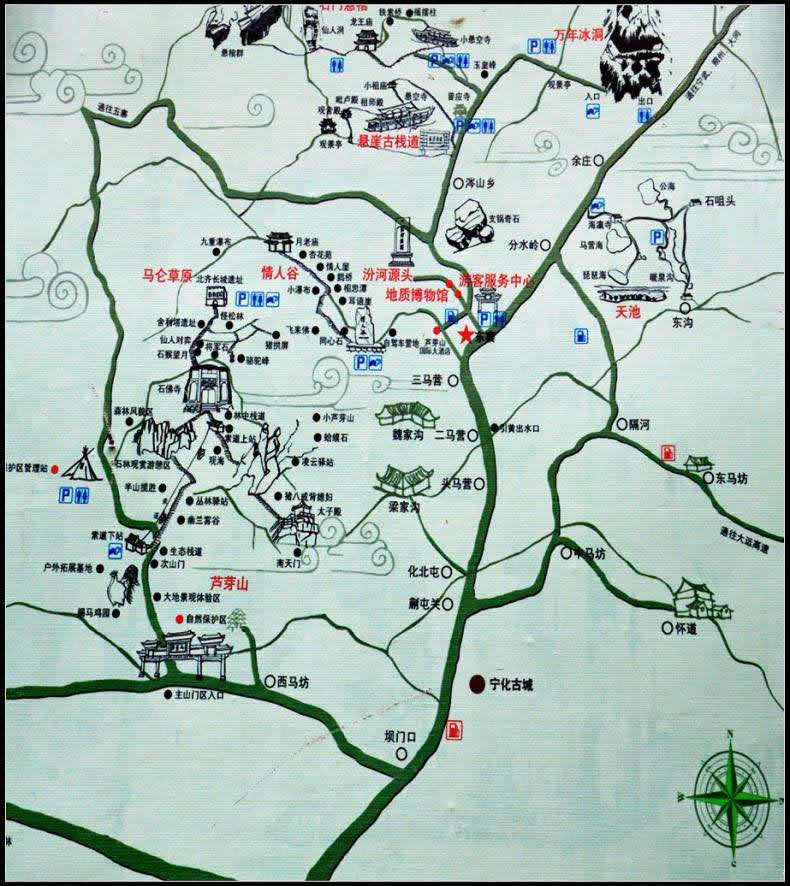 景區(qū)以蘆芽山(太子殿主峰)為中心,包括馬侖草原、小蘆芽山、萬年冰洞、千年地火以及懸崖棧道、天池湖群和情人谷等諸多景點(diǎn)。