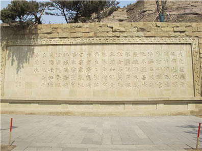 位于云岡石窟一窟山門前的“比丘尼曇媚造像記”石刻,為公元503年(景明四年)的題記。此碑刻有文字110個(gè),再現(xiàn)了當(dāng)時(shí)的社會(huì)背景,表達(dá)了發(fā)愿人比丘尼曇媚對(duì)佛教的高度信仰與虔誠(chéng)以及希望佛教振興發(fā)展的愿望,文筆優(yōu)美,堪稱佛教發(fā)愿文之最。此碑也向我們展示了北魏時(shí)期一種特有的字體。因這種字體在當(dāng)時(shí)多用于碑文,所以后人稱它為魏碑體。魏碑字體外方內(nèi)圓、拙樸有力,是隸書向楷書過渡的字體。由此看來,魏碑書法應(yīng)是北魏平城時(shí)的創(chuàng)造。原物很小,只有30厘米高,28厘米寬,于1956年20窟前考古發(fā)掘,現(xiàn)存于云岡博物館中。