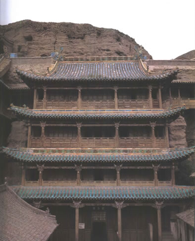 第5窟位于云岡石窟群中部,與第6窟是一組統(tǒng)一設(shè)計(jì)、建造的雙窟,屬于云岡中期洞窟?咄飧饔幸蛔屙樦伟四昙由w的四層五間式木構(gòu)閣樓,清代號(hào)稱“云岡佛閣”或“石窟摩云”,為云中八景之一。這對(duì)豎式設(shè)計(jì)的雙子佛閣,既亭亭玉立,又合璧莊重,體現(xiàn)了我們祖先工匠對(duì)石窟寺殿宇的精準(zhǔn)理解,也是目前云岡石窟僅存的古代窟檐建筑。它除了具有佛殿功能外,同時(shí)還起到遮風(fēng)擋雨作用,特別是保持了窟內(nèi)溫濕度的相對(duì)恒定,使得第5、6窟的造像雕刻保存狀態(tài)遠(yuǎn)優(yōu)于其它無窟檐的洞窟。