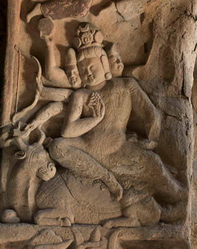 窟門拱頂正中雕一朵團(tuán)蓮,四周飛天起舞。內(nèi)側(cè)上拱邊框?yàn)檫B續(xù)排列的忍冬葉,周圍雕伎樂天人。拱內(nèi)側(cè)壁分為上下層,下層為天王門神,逆發(fā)胡人形象,手持金剛杵或三叉戟。上層雕出多頭多臂神像,東壁雕三頭四臂,西壁雕三頭六臂。