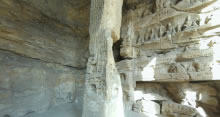 第7窟前室北壁上開明窗,下鑿窟門,壁面風(fēng)化嚴(yán)重,但其窗門外側(cè)殘留的多層造像與印度阿旃陀的大拱門洞窟外壁雕刻十分相似。第7窟前室東壁上部均分層分欄雕刻佛本生故事畫面。后室北壁造像分為上下兩層大龕,下層龕內(nèi)為二佛并坐。上層龕內(nèi)中央主像為交腳彌勒菩薩,兩側(cè)為倚坐佛像。