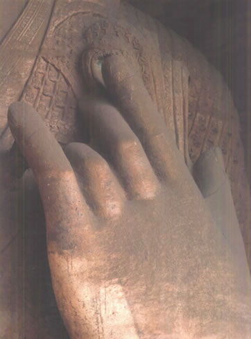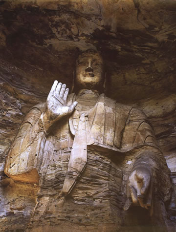 露天大佛高約13.7米,端坐于石臺(tái)座之上。佛首磨光肉髻,方圓面相,廣額豐頤,眉眼細(xì)長(zhǎng),鼻梁挺直,大耳垂肩;眉間施白毫,嘴唇略薄,唇上、下巴有八字胡須。眼中瞳孔為琉璃鑲嵌,大約是在遼代安裝。佛身挺拔壯碩,兩肩寬厚,著袒右肩式袈裟。袈裟質(zhì)地厚重,衣褶自然流暢,具有犍陀羅造像遺風(fēng)。大佛內(nèi)衣輕薄貼體,整體疏密得當(dāng),雕刻工藝精湛。大佛神情莊嚴(yán),慈祥泰然,結(jié)跏趺坐,雙手于腹間相會(huì)疊加,呈禪定手印?上植颗c雙腿風(fēng)雨侵蝕,雕飾全無。但是大佛姿態(tài)雄偉,氣宇軒昂,生氣勃勃,融合東西方雕塑藝術(shù)于一體,是兼?zhèn)淞朔鹜印叭、八十種隨形好”的造像珍品。