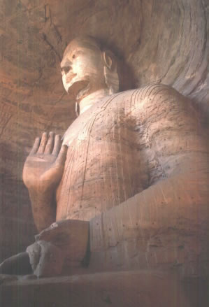 早期石窟:即今第16~20窟,亦稱為曇曜五窟。根據(jù)《魏書·釋老志》(卷114)記載:“和平初,師賢卒。曇耀代之,更名沙門統(tǒng)。初,曇耀于復(fù)法之明年,自中山被命赴京,值帝出,見于路,御馬前銜耀衣,時(shí)人以為馬識(shí)善人,帝后奉以師禮。曇曜白帝,於京城西武州塞,鑿山石壁,開窟五所,鐫建佛像各一,高者七十尺,次六十尺,雕飾奇?zhèn),冠于一世!蔽闹杏浭龅拈_窟五所,就是當(dāng)時(shí)著名的高僧曇曜就選擇了鐘靈毓秀的武州山,開鑿了雄偉壯觀的曇曜五窟,揭開了云岡石窟開鑿的序幕。第16~20窟即帝王象征的曇曜五窟,以造像的風(fēng)格和創(chuàng)作的技法來看,是云岡全窟群中最早的五個(gè)窟。平面為馬蹄形,穹隆頂,外壁滿雕千佛。主要造像為三世佛(過去、現(xiàn)在、未來),佛像高大,面相豐圓,高鼻深目,雙肩齊挺,顯示出一種勁健、渾厚、質(zhì)樸的造像作風(fēng)。其雕刻技藝?yán)^承并發(fā)展了漢代的優(yōu)秀傳統(tǒng),吸收并融合了古印度犍陀羅、秣菟羅藝術(shù)的精華,創(chuàng)造出具有獨(dú)特的藝術(shù)風(fēng)格,這是中外融合所形成的新的藝術(shù)風(fēng)格。