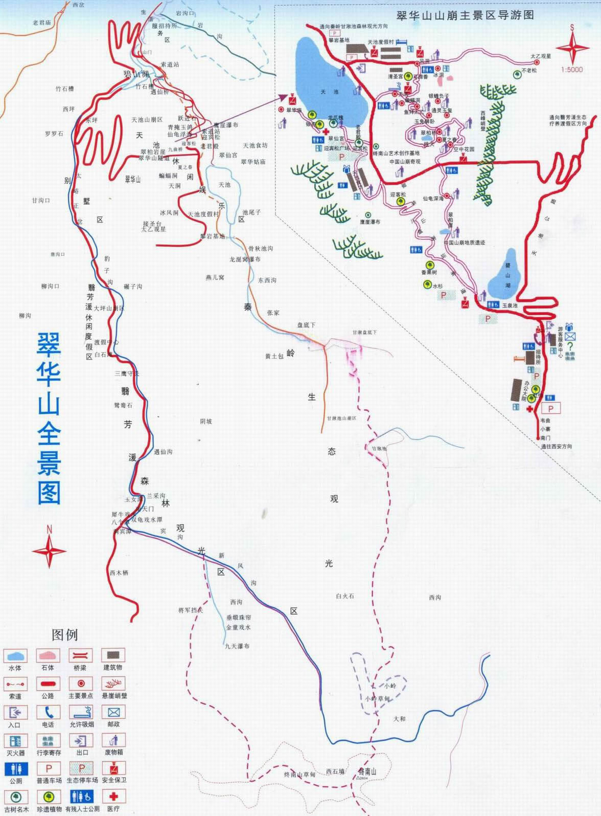 翠華山秀美的湖光山色和其國內(nèi)罕見的山崩地貌使翠華山以“終南獨秀”和“中國地質(zhì)地貌博物館”著稱。翠華山高峰環(huán)列,峭壁聳立,險不可攀,中有一天然水池,稱“天池”,又稱“太乙池”或“龍移湫”,池水面積約5萬平方米。湫池群山環(huán)峙,碧波蕩漾,清明如鏡,纖塵不染。池南的太乙殿,是舊時遇旱祈雨之所。還有呂公洞、黃龍洞,池北的冰洞、風洞、八仙洞等。冰洞在盛夏仍堅冰垂凌,風洞則四季寒風颼颼。冰洞東南有飛流直下的瀑布。