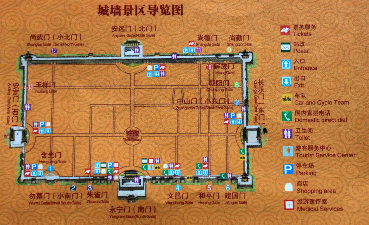 民國(guó)后至新中國(guó)成立后,新辟城門(mén)12座,東有朝陽(yáng)門(mén)、中山門(mén),北有解放門(mén)、尚武門(mén)、尚德門(mén),西有玉祥門(mén),南有含光門(mén)、勿幕門(mén)、朱雀門(mén)、和平門(mén)、文昌門(mén)、建國(guó)門(mén)。