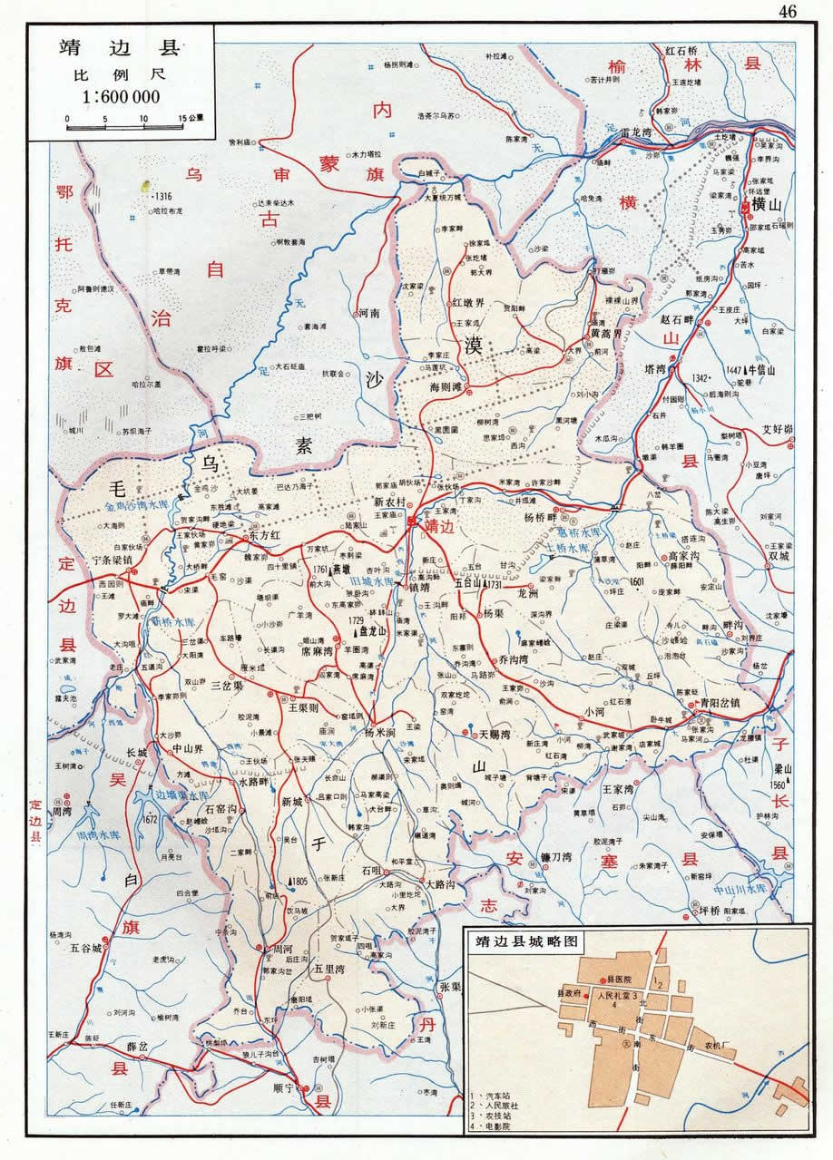 置縣初縣域無(wú)考。清乾隆年間(1736~1795),新城堡為縣城:“東與懷遠(yuǎn)縣清平堡接壤,一百二十里;西與定邊縣柳樹(shù)澗接壤,一百二十里;南與保安縣牛頭坡接壤,一百一十里;北至邊墻十里”(乾隆手抄本《靖邊縣志稿》)。光緒年間(1875~1908),鎮(zhèn)靖堡為縣城:“東至崔家畔一百里,與懷遠(yuǎn)縣之狄青原接界;西至二道渠一百一十里,與定邊縣之茶店圾接界;南至黃花池灘二百一十里,與保安縣之柳溝接界;北門(mén)外即邊墻,出口至四樸樹(shù)六十里,與懷遠(yuǎn)縣之本塔兒梁接界;東南至沈家園子八十里,與安塞縣之平橋接界;西南至闊闊川二百一十里,與定邊縣之侯家岔、甘肅省安化縣之亂石頭接界;東北至毛烏素六十里,與懷遠(yuǎn)縣之許家沙畔接界;西北至史家地坑一百一十里,與定邊縣之二十里塘接界。計(jì)東西廣二百一十里,南北袤二百七十里”(光緒本《靖邊縣志》)。
