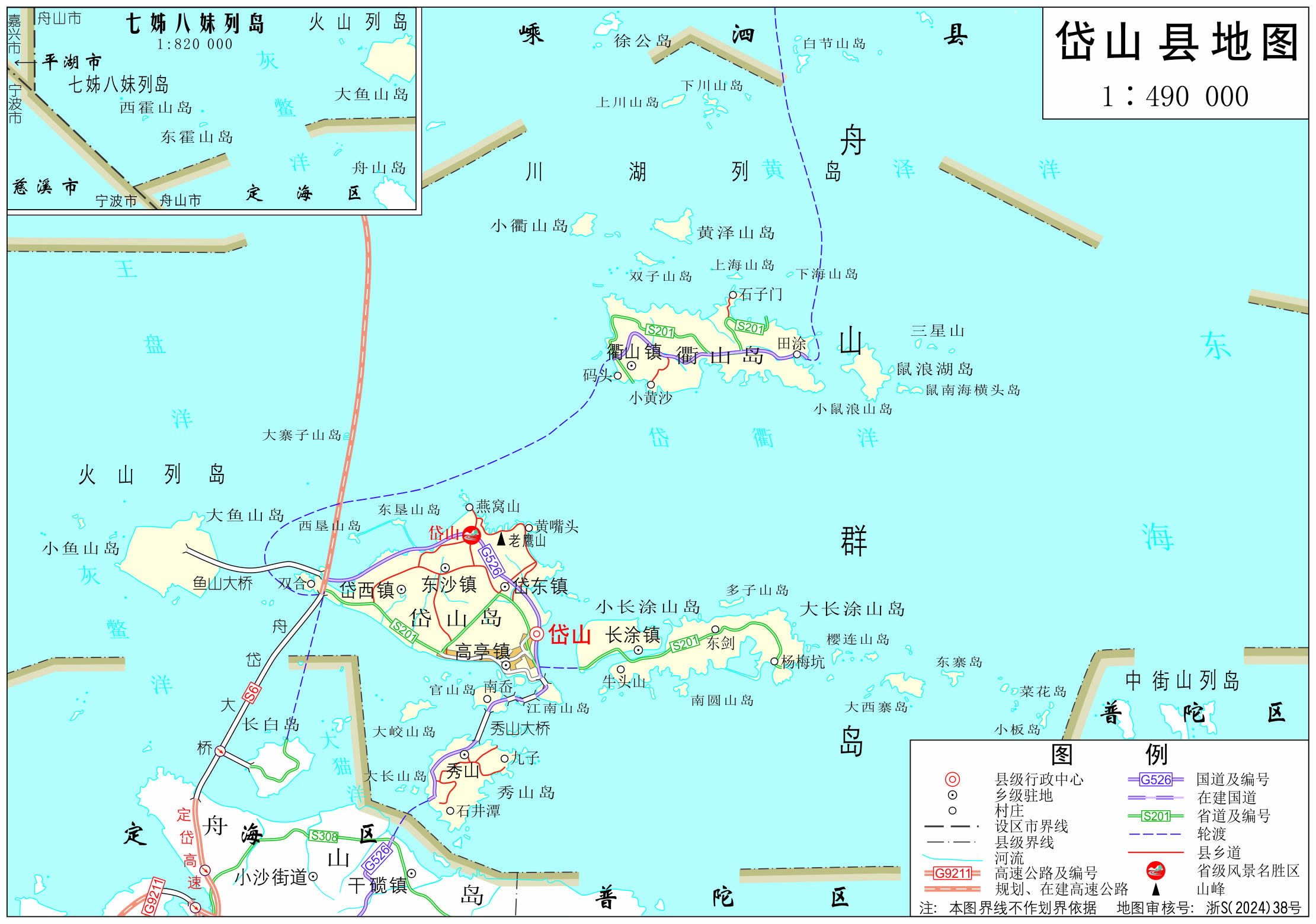 全縣島嶼呈西南-東北走向,以岱山島為中心,諸島嶼呈“X” 型分布。東西長(zhǎng)約169.6公里,南北寬約57公里,由404個(gè)島嶼組成,其中住人島嶼16個(gè)(其中駐鄉(xiāng)鎮(zhèn)政府島嶼5個(gè))。